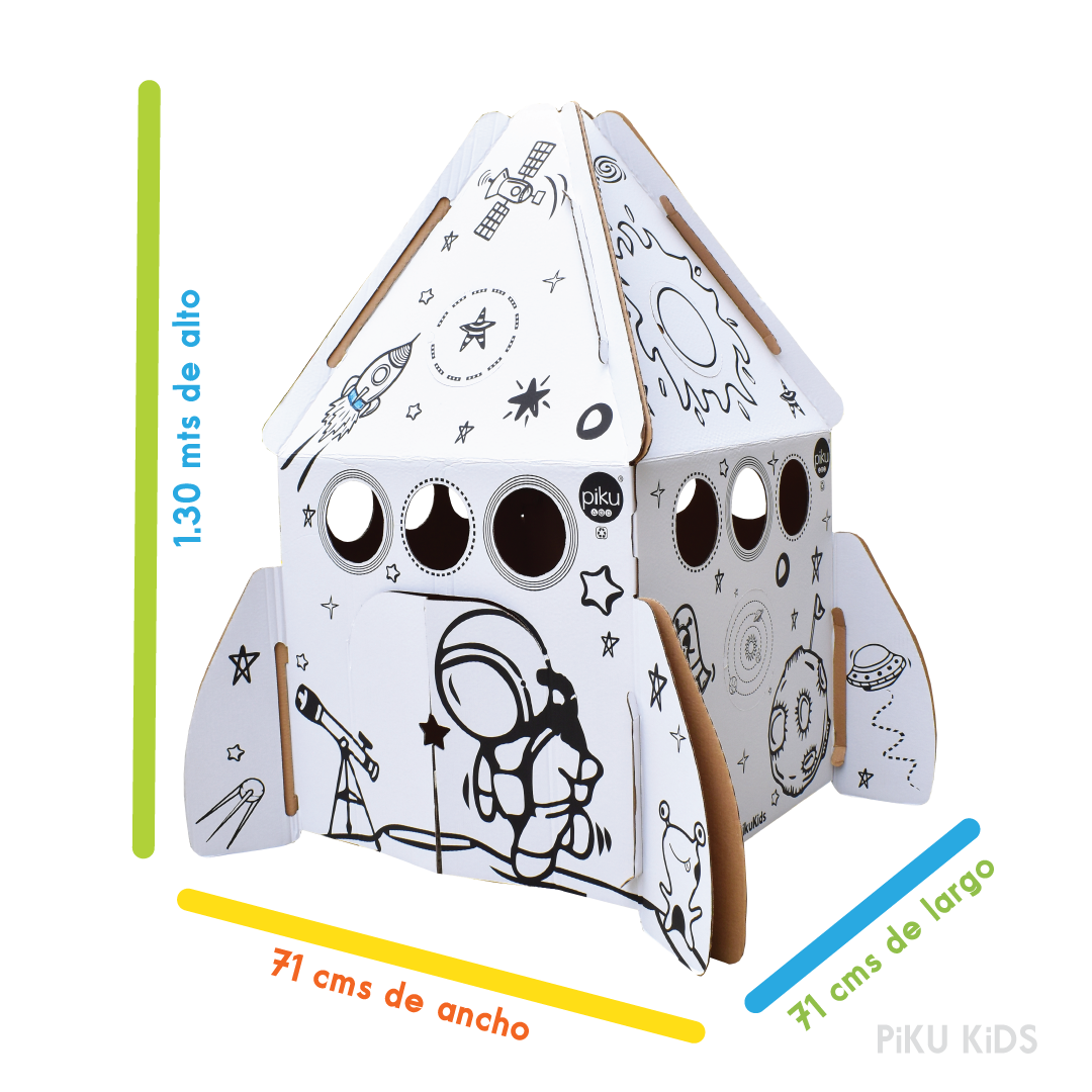 Cohete de cartón para armar, pintar, decorar y jugar por dentro. Apto para niñas y niños a partir de de los 3 años en adelante. Mide 1.30 mts de alto por 71 cms de ancho.