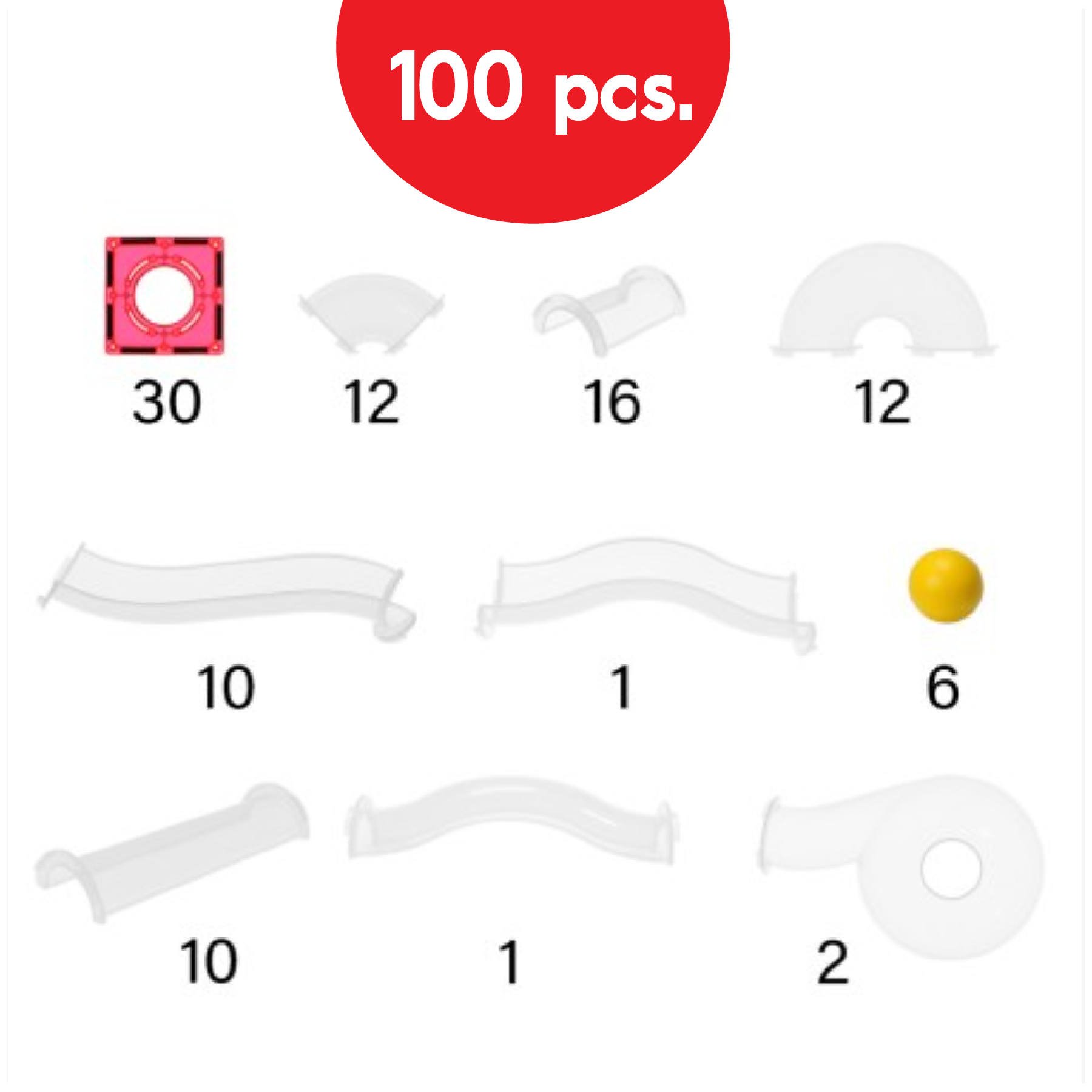 Incluye 100 piezas en total para que dejes volar tu imaginación y despiertes tu lado curioso. Puedes crear estructuras desde cero, e ingeniarte emocionantes caídas para que las bolitas de color se deslicen.